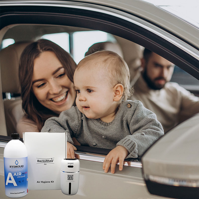 Das Kit enthält 1x BactoAttaQ© Air USB-Diffusor und 1x 1-Liter-Flasche der antimikrobiellen Verneblungsflüssigkeit BactoAttaQ© Air.